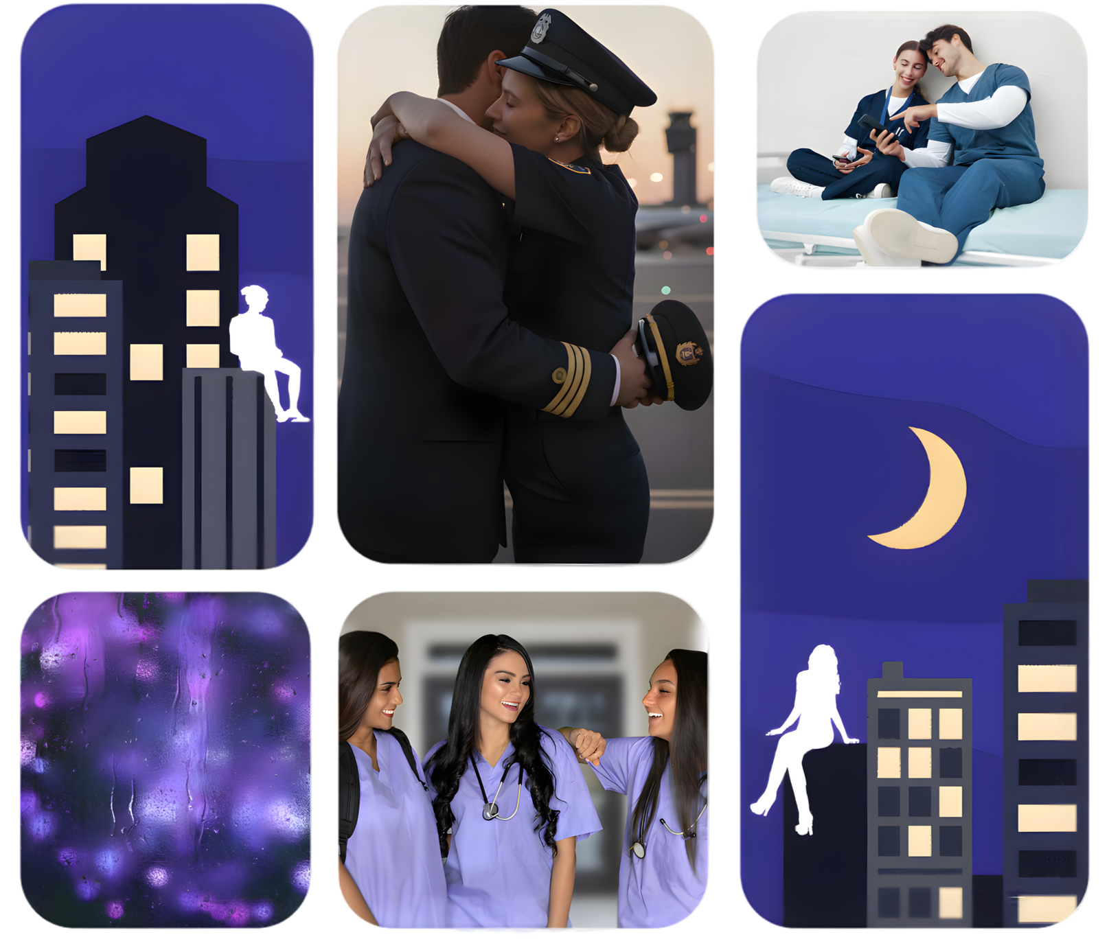 My brand visuals were chosen to blend the themes and colors of night-time with common night shift uniforms and settings.